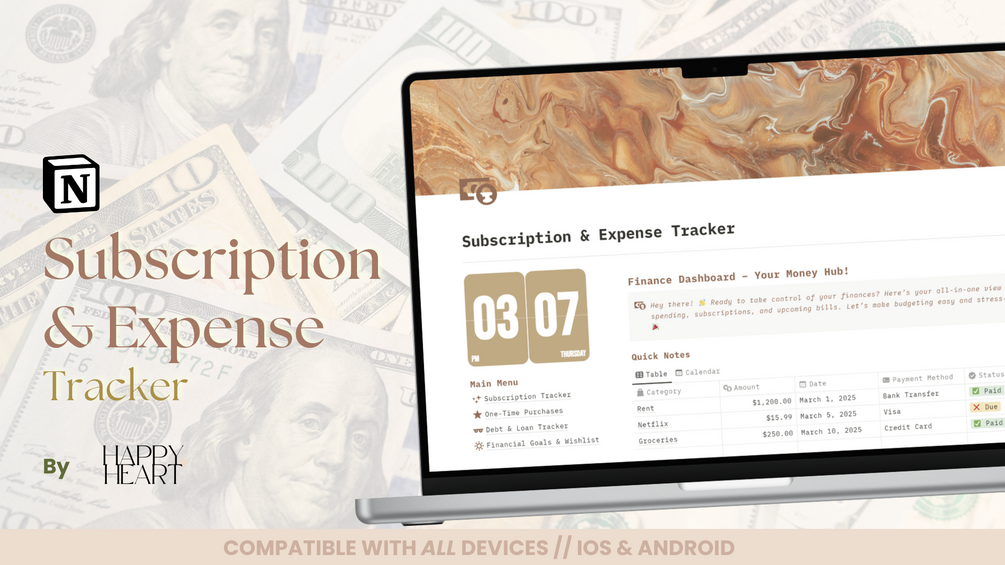 Managing your money doesn't have to be stressful! With the Subscription & Expense Tracker, youβll have a warm, cappuccino-inspired dashboard that turns budgeting into a cozy, organized, and stress-free experience. βπ