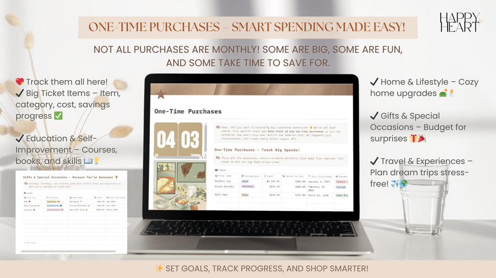 βοΈ One-Time Purchases Tracker β Item, category, cost, savings progress, and a cute progress circle π‘π»β¨